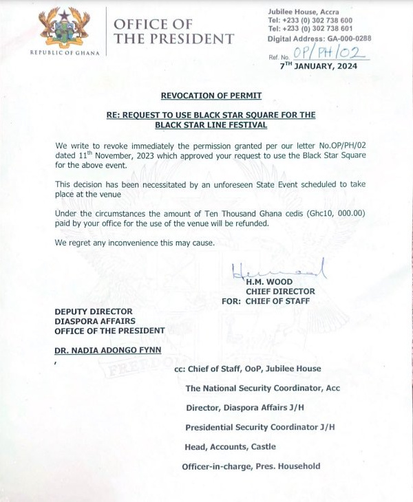 Dated January 7, 2024, and signed by H.M. Wood, the Chief Director, the statement explained that the decision was prompted by an “unforeseen State Event scheduled to take place at the venue.” Additionally, it mentioned that the booking fee of 10,000 Ghana cedis would be refunded to the unidentified organiser of the affected program.