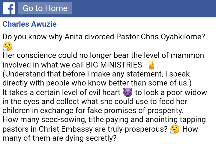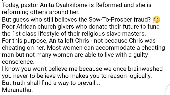 He took to his verified Facebook page to reveal why Anita divorced Pastor Chris Oyakhilome.