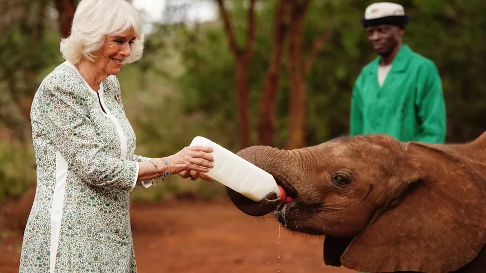 Queen Camilla fed a baby elephant from a bottle when she went to visit a place in Kenya called an orphanage. This place is for baby elephants whose parents were killed by poachers.